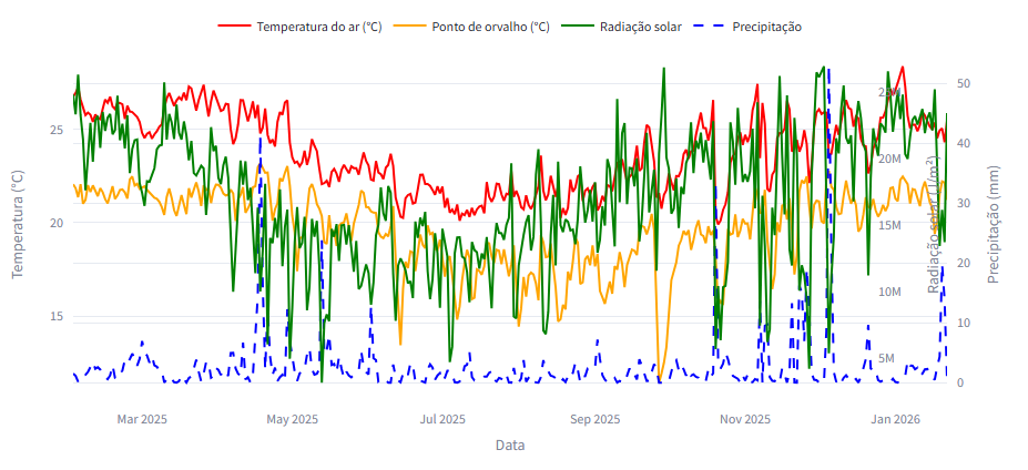 O sistema Safra do Café oferece dados climáticos atualizados diariamente por meio do ERA5, uma plataforma de monitoramento climático global. São fornecidas informações sobre temperatura, precipitação acumulada, umidade do ar e ponto de orvalho para áreas acima de 30 ha.